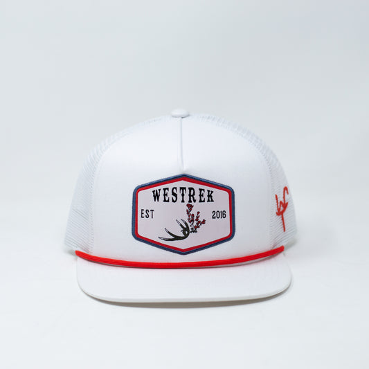 White “Indian Paintbrush with Deer Antler” Trucker Hat – Hand-Drawn Logo | Western Hunting Hat | Westrek