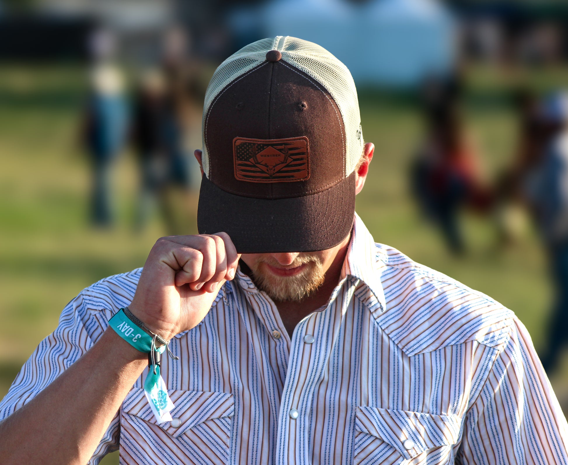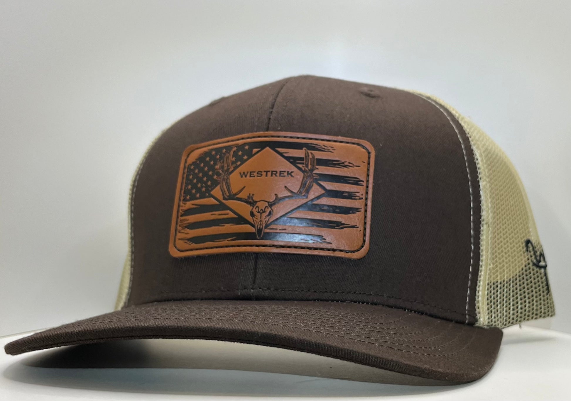 Brown/Tan snapback hat with leather American Skull Buck patch logo.