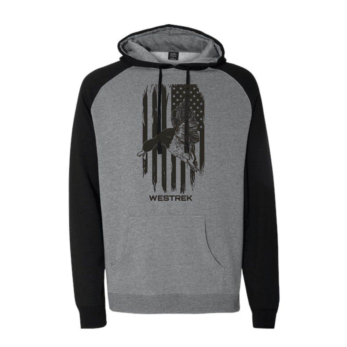 Duck with American flag design. Heater grey body, black sleeves and hood.