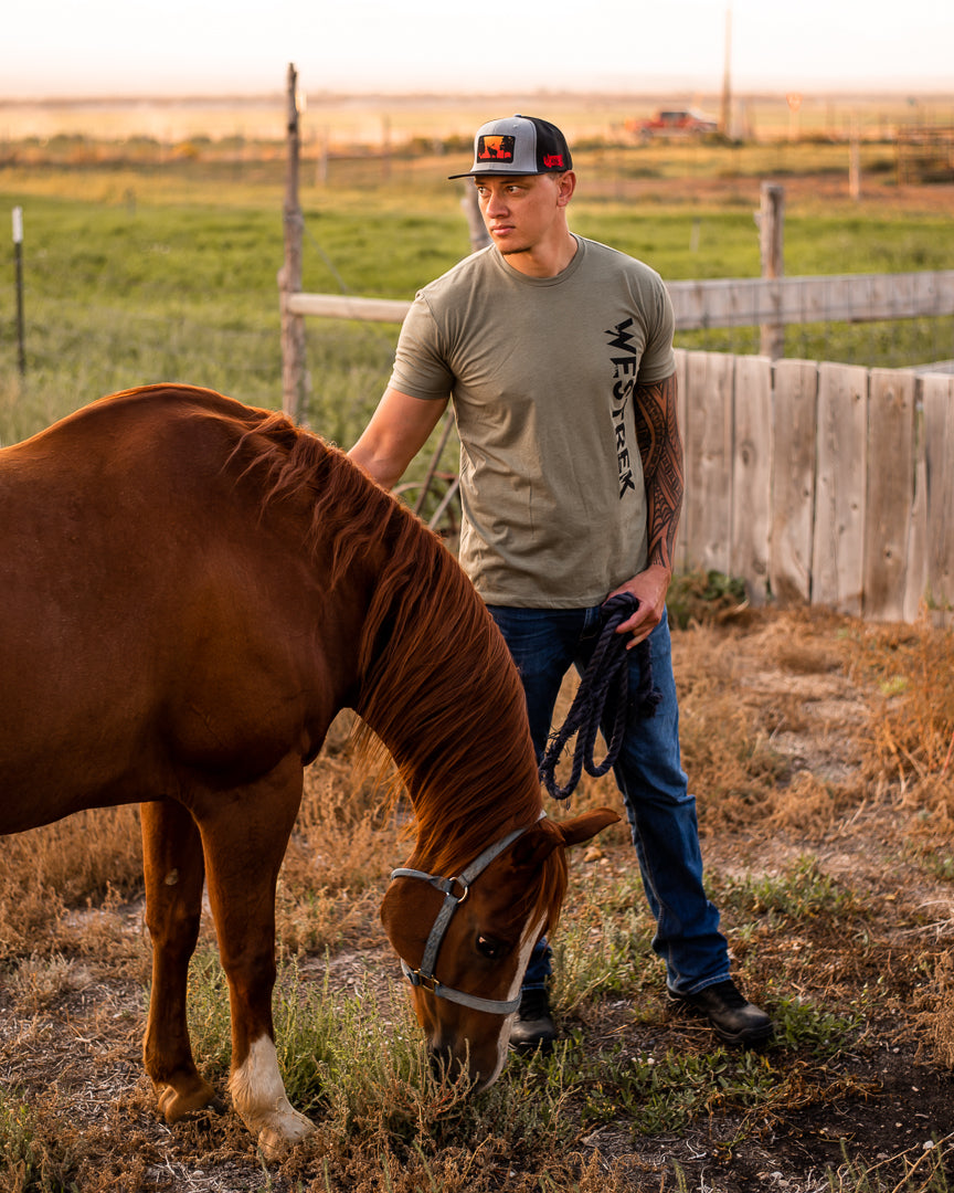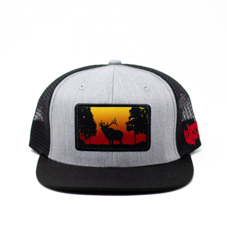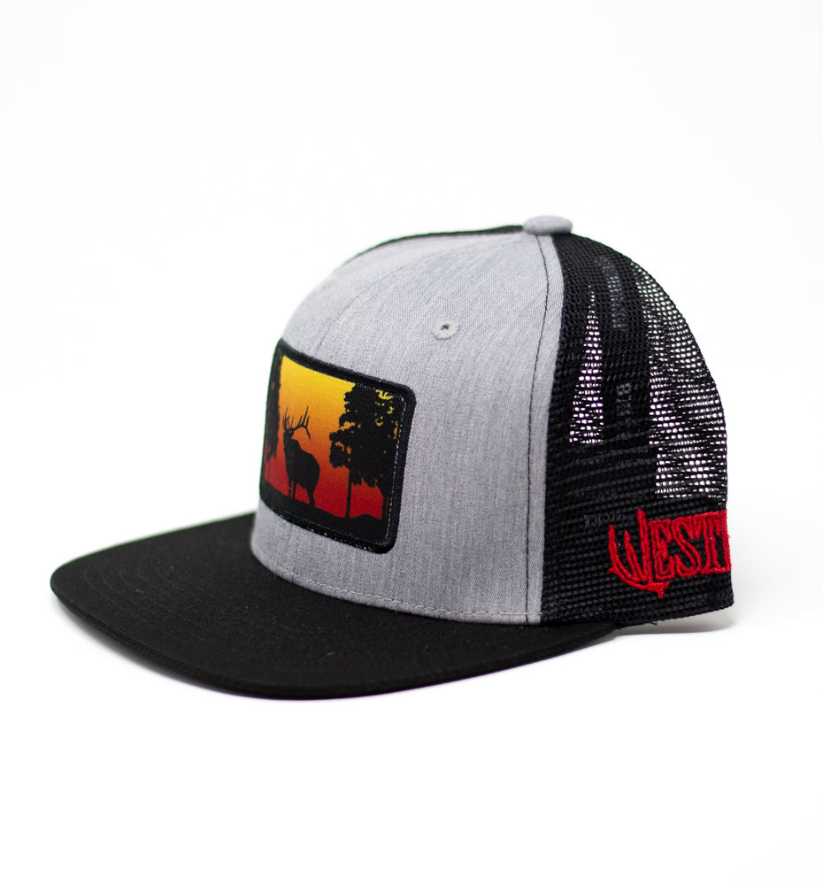 Heather grey front with black mesh back. Flat brim that can easily be curved.
