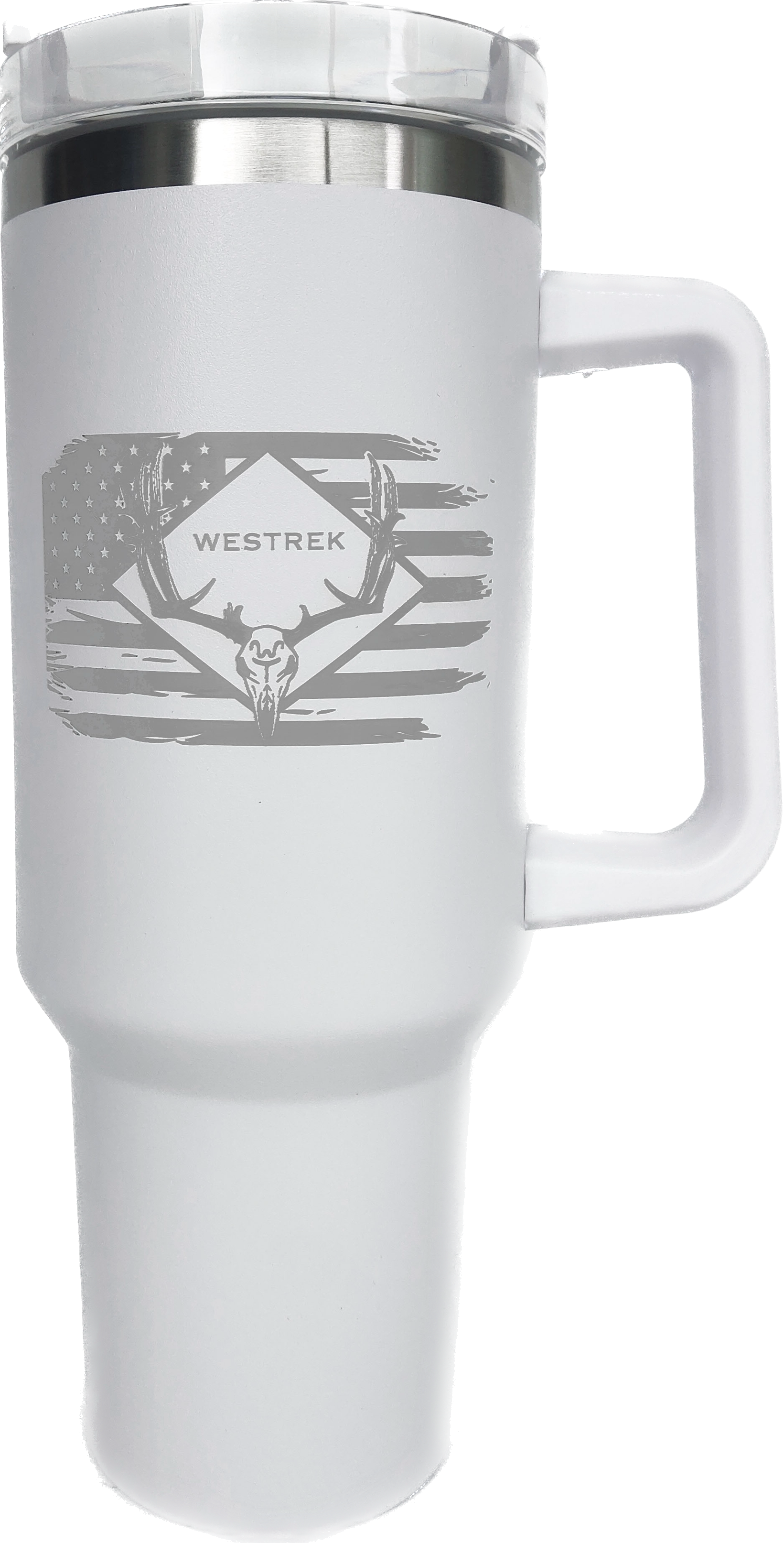 40 oz tumbler with handle. Stainless steel with laser engraved new Westrek flag logo. Big enough to quench your thirst and small enough to fit in your cup holder!