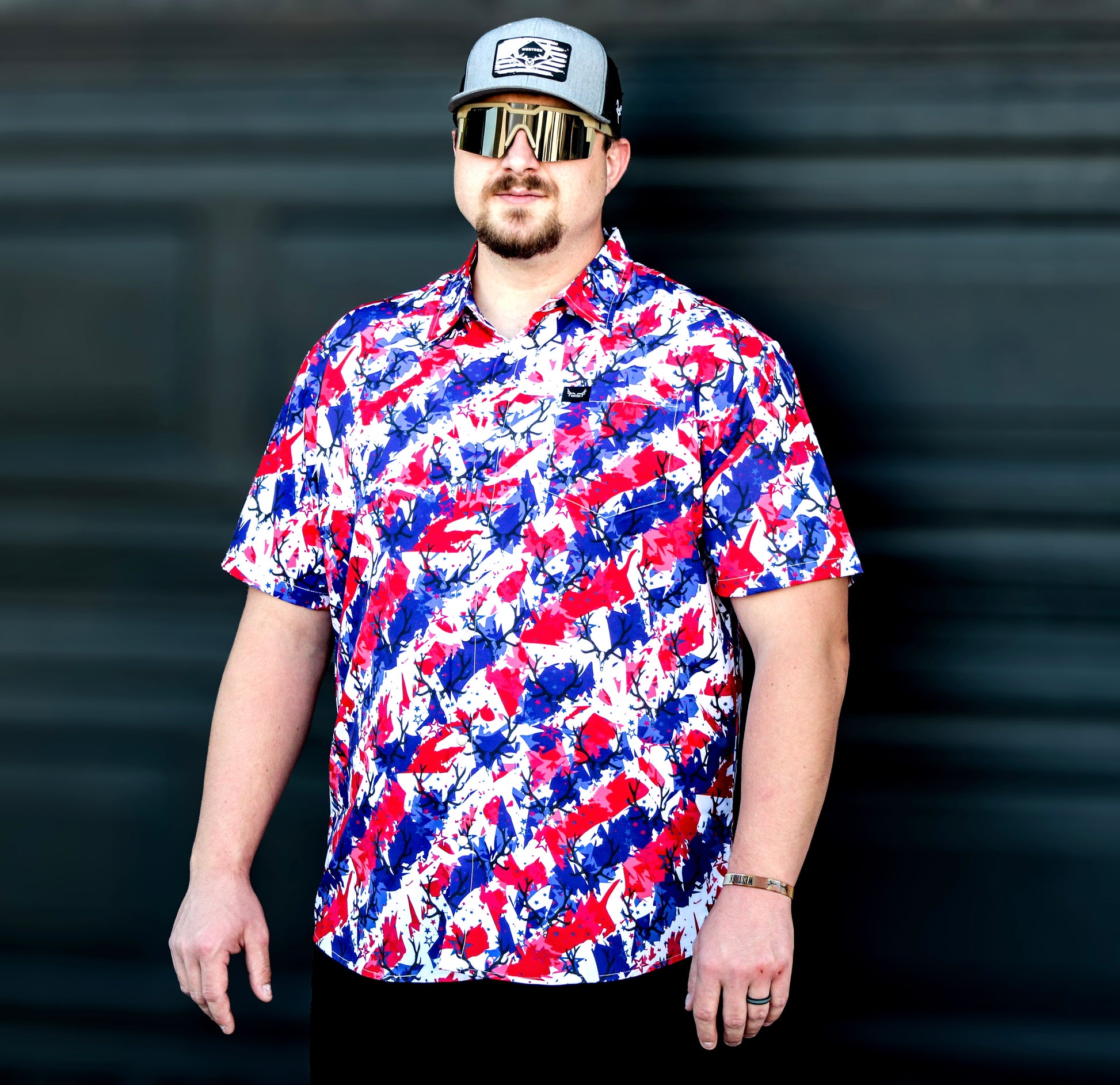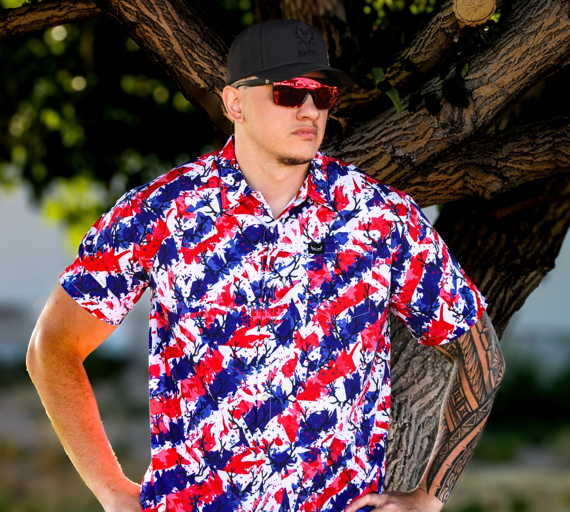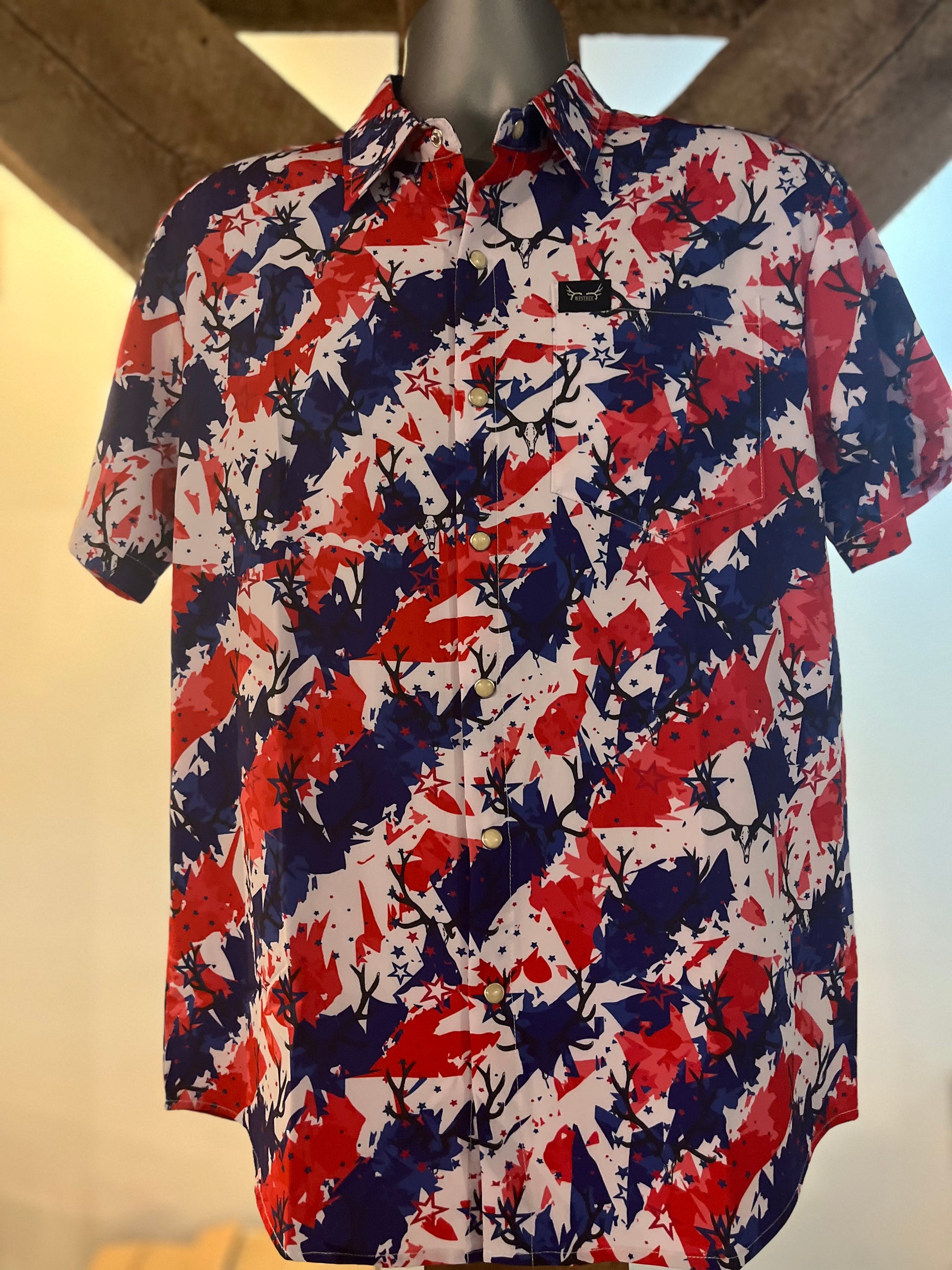 This is our 4th of July Special! Featuring our Skull Elk design, with some Stars and Stripes for that Patriotic 4th of July feel. Featuring Pearl snap buttons. Perfect for your Independence Day barbecue and fireworks! This shirt will make the biceps look meaty like that brisket you’ll be smoking and wit’s the added length on the bottom won’t be showing off your belly button! Snag one today!